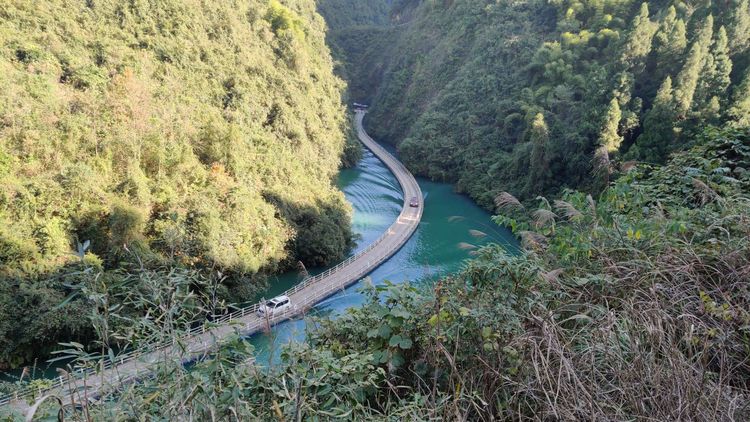 進(jìn)入景區(qū)首先經(jīng)過(guò)的就是獅子關(guān)水電站。之后就到了獅子關(guān)景區(qū)里最有名的景點(diǎn)~“廊橋遺夢(mèng)”,水上浮橋長(zhǎng)度有400米,開(kāi)車是可以直接上浮橋的,車過(guò)去的時(shí)候浮橋飄起打得水面形成一道道的水波紋。在浮橋正對(duì)的山腰有浮橋觀景臺(tái),站在上面可以俯瞰整個(gè)浮橋景觀。過(guò)了浮橋往山谷之間開(kāi),會(huì)看到獅子關(guān)漂流道和獅吼瀑布,水流湍急,聲如獅吼。